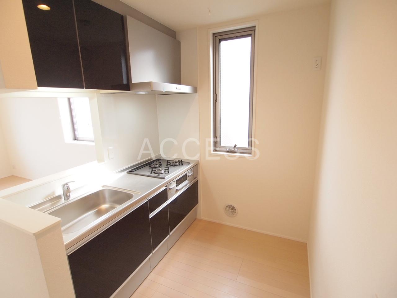 インターホン(TVモニター付)、オートロック、 フローリング、 ベランダ、南面バルコニー、 クローゼット(1ヵ所)、収納スペース、玄関収納、下駄箱、 バストイレ(別室)、洗濯置き場(室内)、追焚、浴室乾燥機、脱衣所、給湯、ウォシュレット、洗面所にドア、洗面台、洗面所独立、独立洗面台、 コンロ設置済(3口)、コンロ種類(都市ガス)、グリル、システムキッチン、対面キッチン、 エアコン(全室)、 BS、CS、 光ファイバー 二面採光、角部屋