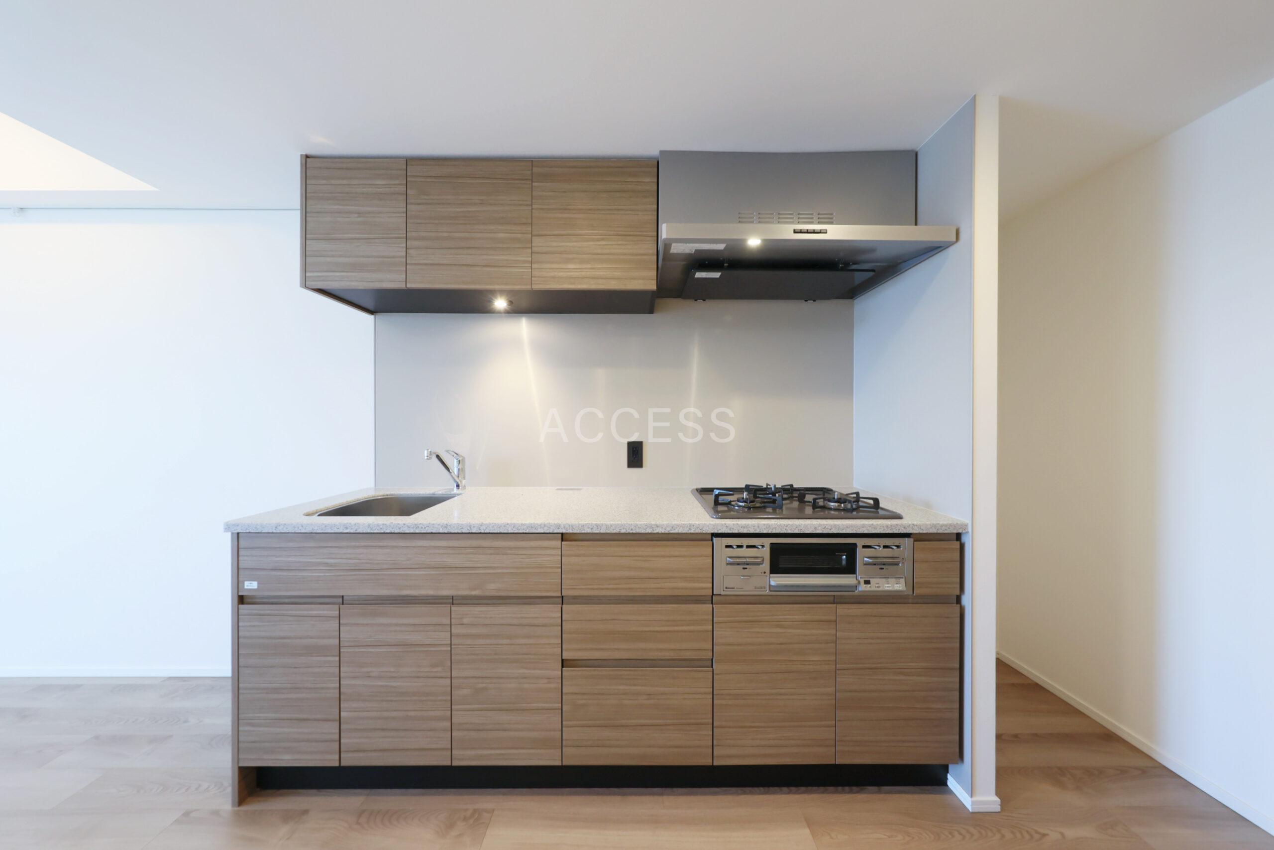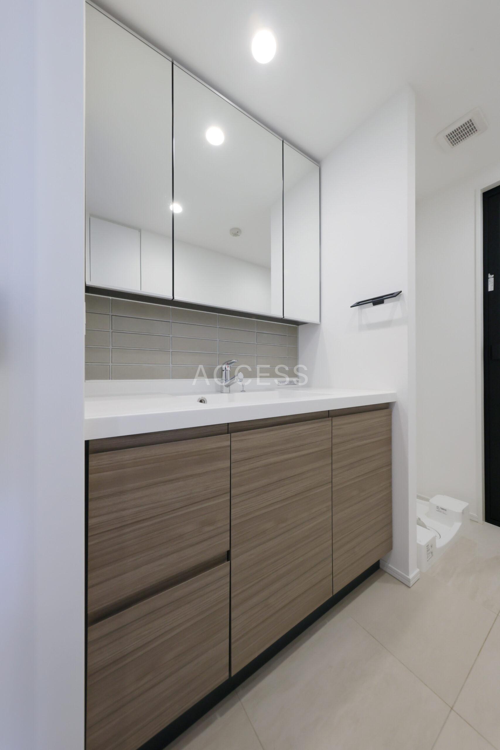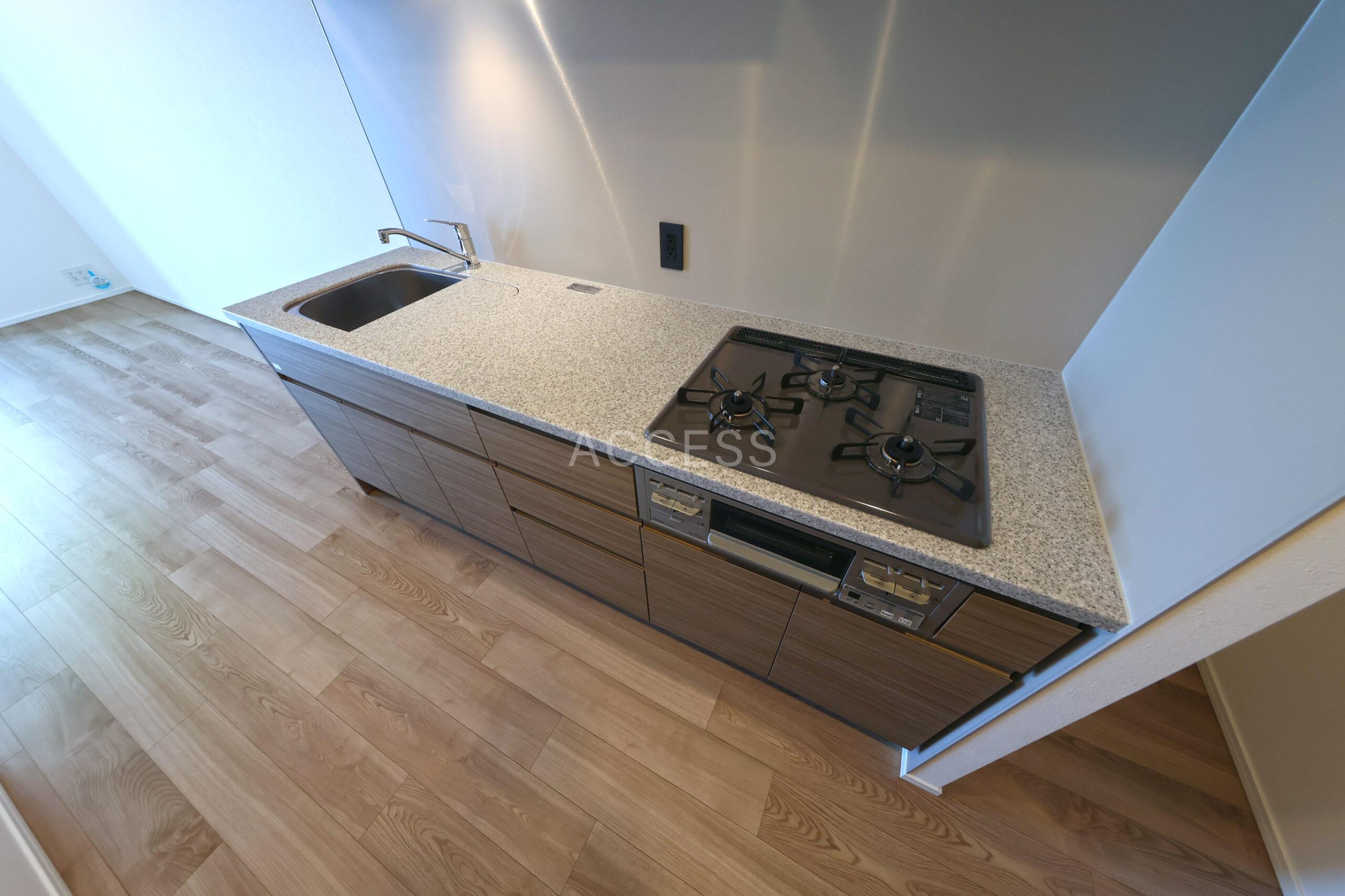 3口ガスコンロ・グリル付キッチン、三面鏡付独立洗面台、追焚・浴乾付きバスルームなど暮らしに寄り添った充実設備。